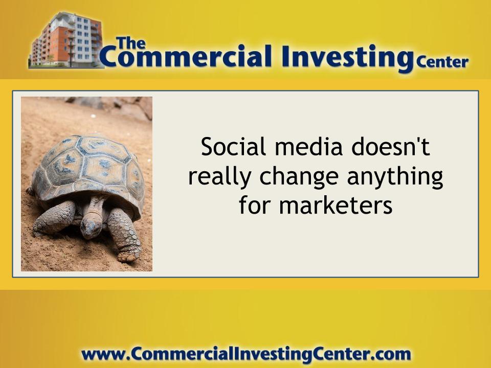 A five-year old article posted at TwistImage.com made us here at the Commercial Investing Center stop and scratch our collective heads. The author (Mitch Joel) decided to turn conventional wisdom around and look at the slow benefits of engaging in social media. The very thought of removing your foot from the marketing accelerator probably caused a good many of you to throw up in your mouth a little just now. For those still reading, let’s take a moment to appreciate how media like Facebook, Twitter, blogging, and podcasting might yield more results when approached at the pace of the tortoise rather than the hare.